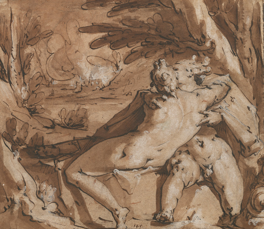 Embracing Couple (Mercury and Lara?); Jan Harmensz. Muller, Dutch, 1571 - 1628; 1588 - about 1594; Black chalk, pen and brown ink, brush with brown wash, heightened with white gouache, on light brown paper