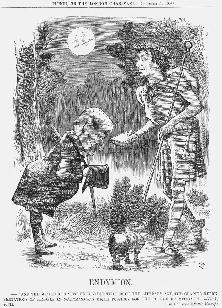 'Endymion', 1880. Disraeli, Earl of Beaconsfield, is the former Conservative Prime Minister. Now in opposition, he had used his free time to publish what would be his final novel, Endymion. In Greek mythology, Endymion is a beautiful young man loved by Selene, the Moon Goddess, who granted him eternal sleep so that he would remain forever young. In the early 1800s, Keats had published his epic poem, Endymion, which portrayed him as a 'brain-sick shepherd prince', which probably explains why Disraeli is depicted holding a shepherd's crook. From Punch, or the London Charivari, December 12, 1880.