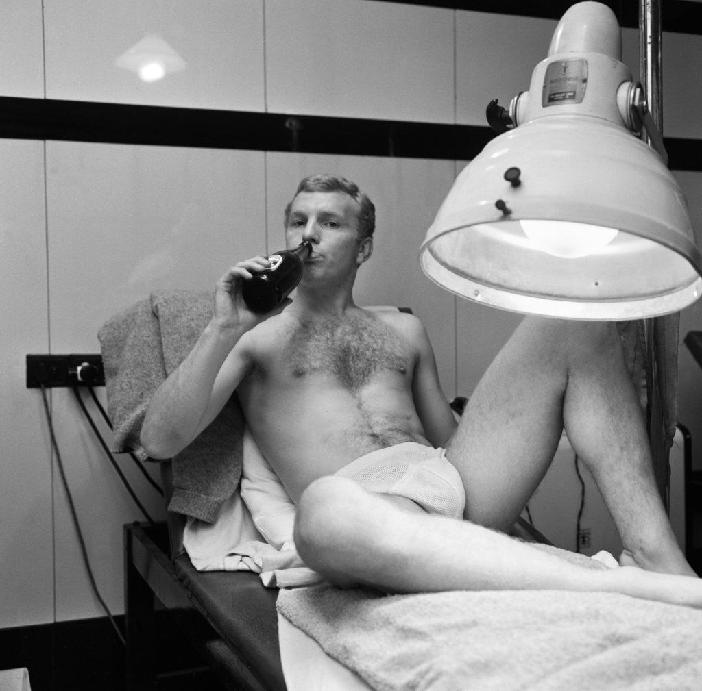 West Ham United captain Bobby Moore spending a few quiet minutes under the sun lamp with a bottle of beer to celebrate his team's victory over Manchester United to reach the FA Cup Final. 15th March 1964.