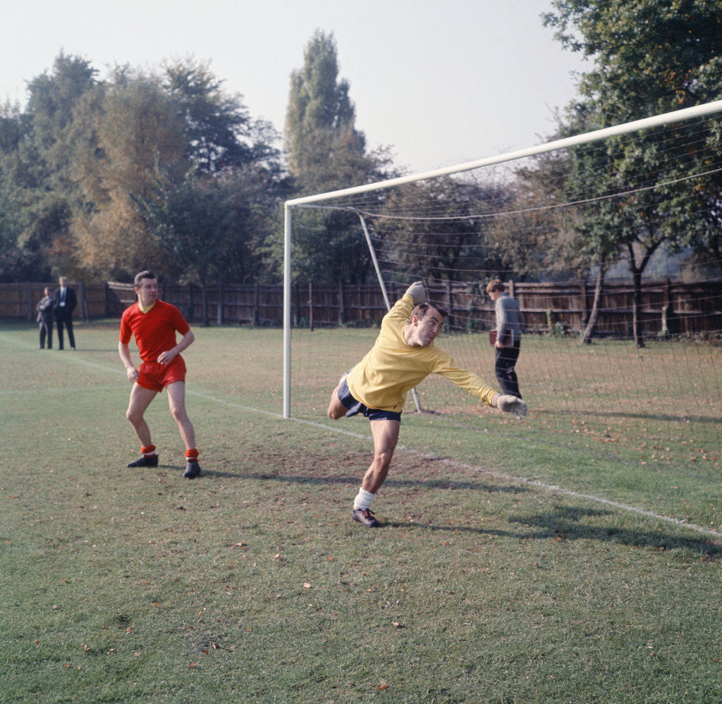 Enggland team training session ahead of their international match against Belgium. Jimmy Greaves in goal with Johnny Byrne. 11th October 1964.