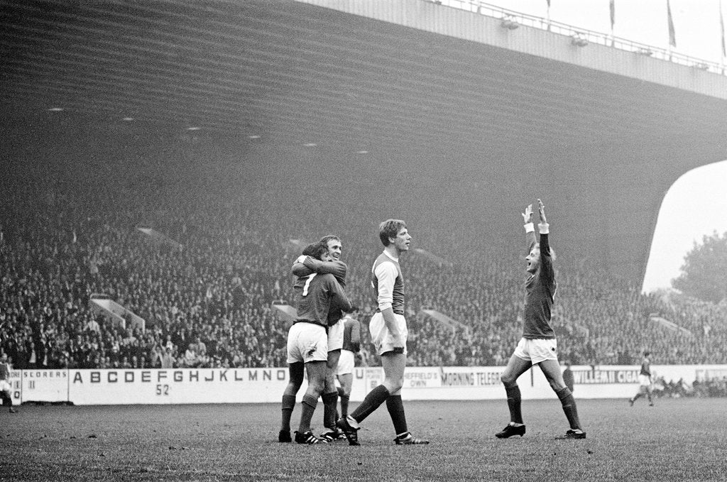 English League Division One match at Hillsborough. Sheffield Wednesday 1 v Manchester United 1. United 's George Best (7) is congratulated on his goal by teammate Pat Crerand as Denis Law comes in to join the celebrations. 16th September 1967.