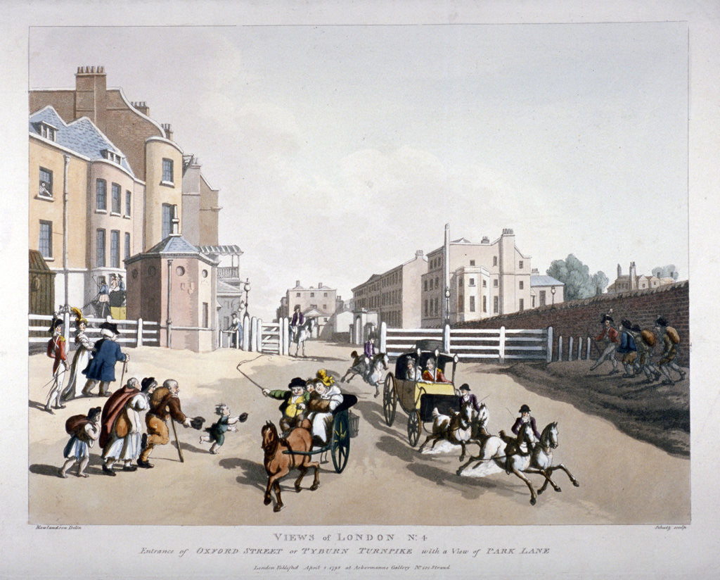 Entrance to Oxford Street at the Tyburn Turnpike, London, 1798. View showing Park Lane, with figures, including an impoverished family, horses and carriages.