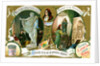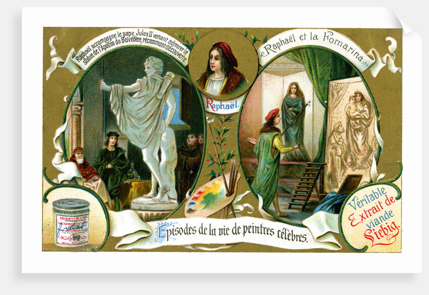Episodes of the Life of Famous Painters: Raphael, (c1900). Raphael Sanzio (1483-1520) joins Pope Giulio II in admiring the statue of Apollo di Belvedere, recently discovered. Raphael and La Fornarina. French advertisement for Liebig's extract of meat.
