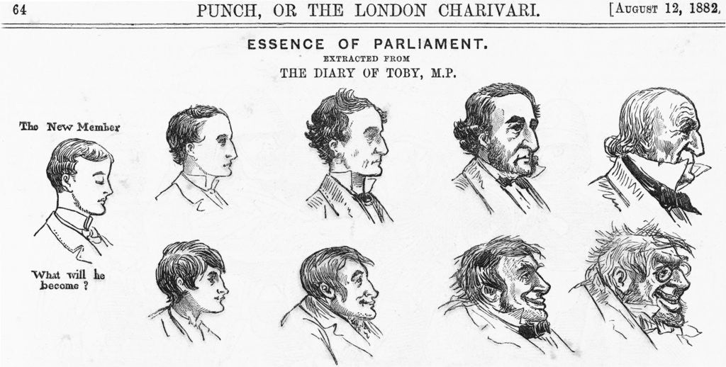 'Essence of Parliament', 1882. The new young MP might, over the coming years, turn into a handsome and dignified elder statesman. On the other hand, he might not. From Punch, or the London Charivari, August 12, 1882.