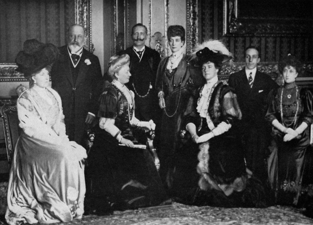 European royalty at Windsor Castle, 17th November 1907 (1964). Queen Ena of Spain, King Edward VII, the German Empress, Kaiser Wilhelm II of Germany, Queen Alexandra, Queen Amelia of Portugal, King Alfonso of Spain and Queen Maud of Norway. A print from King Edward the Seventh, by Philip Magnus, William Clowes and Sons Ltd, London, 1964.