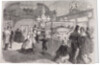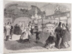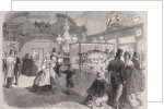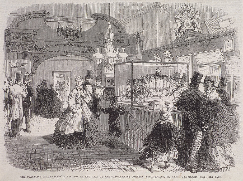 The Operative Coachmakers' exhibition in the Hall of the Coachmakers' Company, Noble Street, London, 1865. Scene shows adults and children looking at coach models.