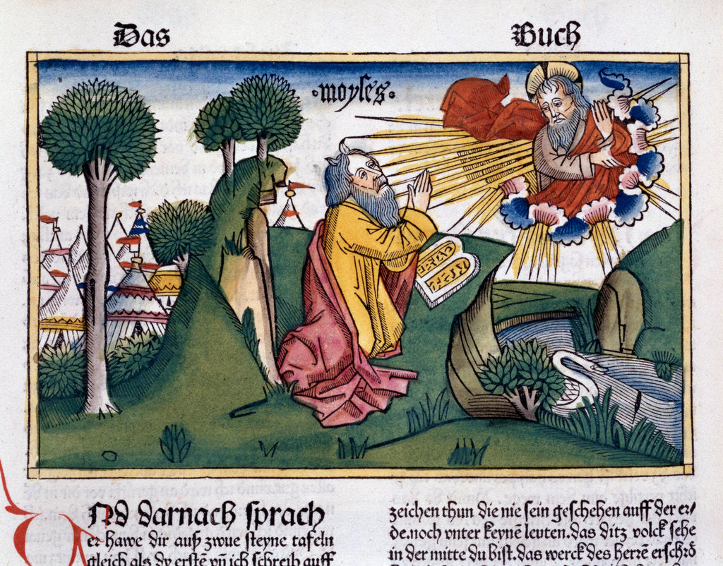Exodus 34:1-10: Moses receives the second tablets with the Ten Commandments. Facsimile copy of a 15th century manuscript of the German School.