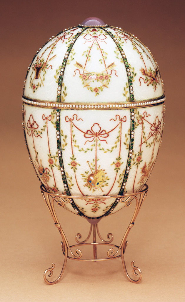 Faberge Kelch Bonbonniere egg shown in a gold egg-stand of scroll design