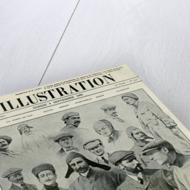 Famous aviators, cover of L'Illustration, 4 September 1909. Aviators present at the Grande semaine d'aviation de la Champagne, the world's first aviation meeting, held at Bétheny from 22 to 29 August 1909. The event attracted a million spectators. Depicted are Andre Fournier, Ferdinand Ferber (1862-1909), Henri Rougier (1876-1956), Louis Charles Breguet (1880-1955), Etienne Bunau-Varilla (1890-1961), Roger Sommer (1877-1965), Léon Delagrange (1872-1910), Glenn Curtiss (1878-1930), Paul Tissandier (1881-1945), Louis Paulhan (1883-1963), Louis Blériot (1872-1936), Charles de Lambert (1865-1944), Henri Farman (1874-1958), Eugène Lefebvre (1878-1909) and Hubert Latham (1883-1912).