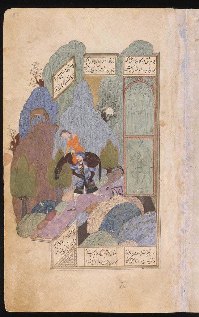 Farhad Carries Shirin and her Horse on his Shoulders, 1431. Found in the collection of the State Hermitage, St. Petersburg.
