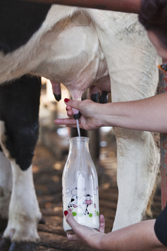 Product images of Farmer hand milking cow into milk bottle