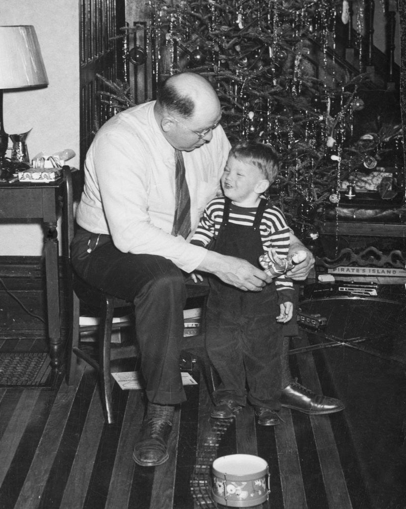 Product details Father and son enjoy Christmas morning, ca. 1950