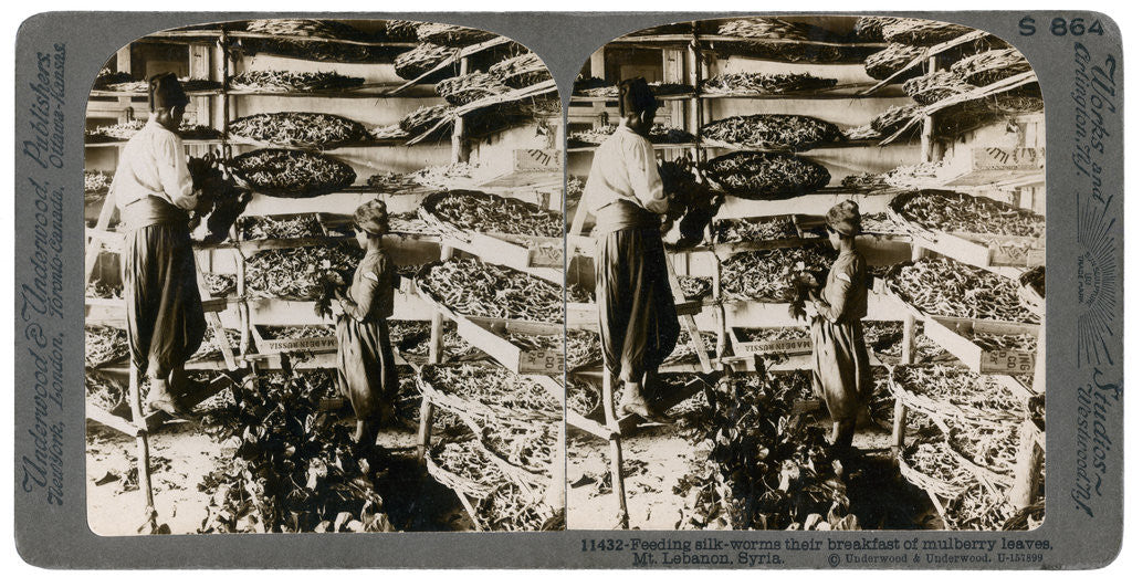 Feeding silkworms their breakfast of mulberry leaves, Lebanon mountains, Syria, 1900s. Stereoscopic slide.