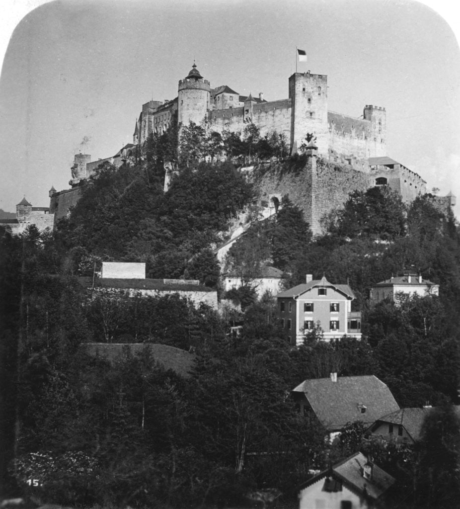 Festung Hohensalzburg, Salzburg, Austria, c1900s. Festung Hohensalzburg (High Salzburg Fortress in German) is a castle in the Austrian city of Salzburg. It sits on Festungberg hill and is one of the largest medieval castles in Europe. Stereoscopic card. Detail.