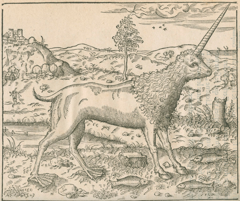 Figure of the Camphur, a mythological beast resembling the unicorn, with a single horn and mane. The creature is amphibious, with hoofed front legs and webbed rear ones. Set in a landscape that includes a castle on a hill and a pair of human figures, The camphur is shown with fish on the ground around it, presumably to indicate its supposed diet. . Illustration from Discours d'Ambroise Pare ... a scavoir, de la mumie, de la licorne, des venins, et de la peste, avec une table des plus notables matieres contenues esdit discours (Gabriel Buon, Paris, 1582), f.20. Ambroise ParÚ (c.1510-1590) was a French barber-surgeon and anatomist who served several Kings of France.
