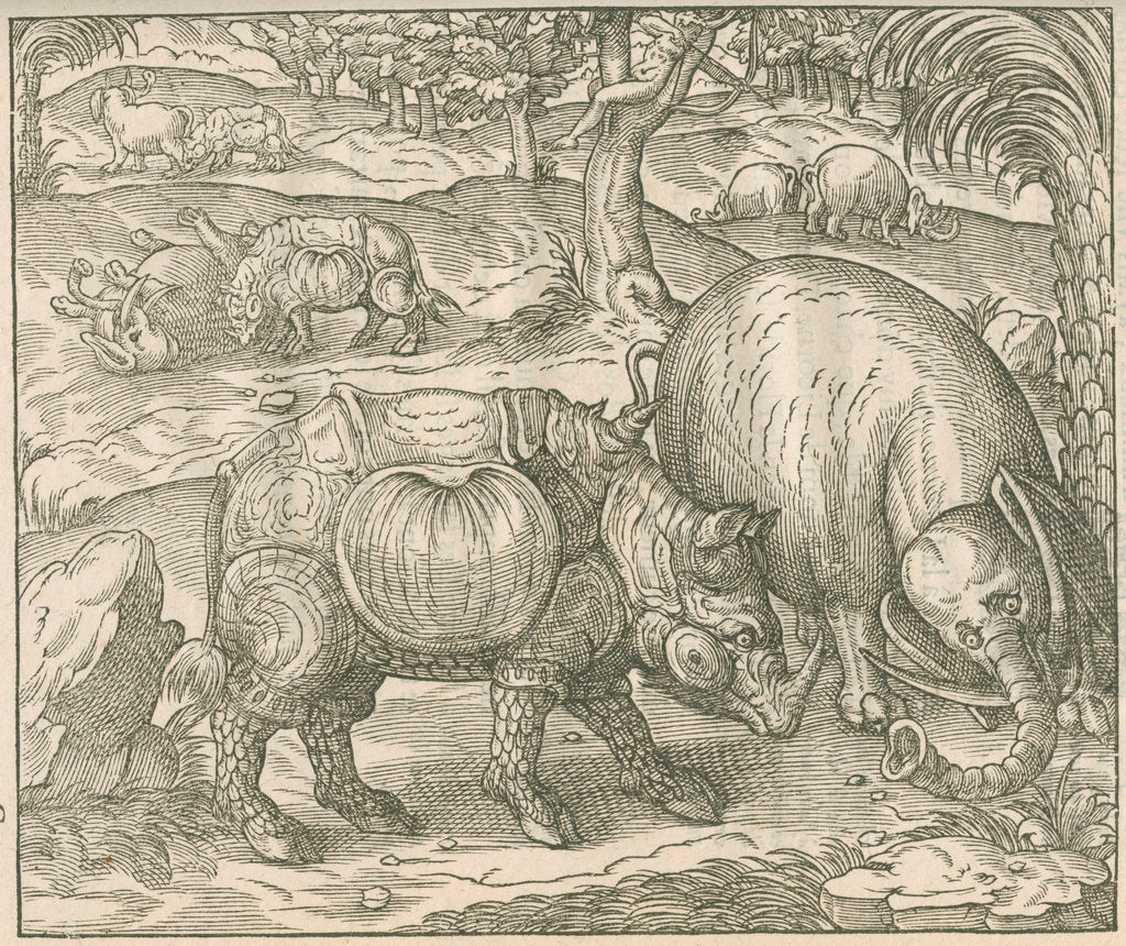 Fantastical scene of battle between a rhinoceros and an elephant in a wooded landscape. Three stages of the contest are shown in the foreground, middle and far distance. Elsewhere a human hunter armed with a bow is shown in a tree, hunting elephants. This print originally appeared in Andre Thevet's La cosmographie universalle (1575). Illustration from Discours d'Ambroise Pare ... a scavoir, de la mumie, de la licorne, des venins, et de la peste, avec une table des plus notables matieres contenues esdit discours (chez Gabriel Buon, Paris, 1582), f.25. Ambroise ParÚ (c.1510-1590) was a French barber surgeon and anatomist who served several Kings of France.