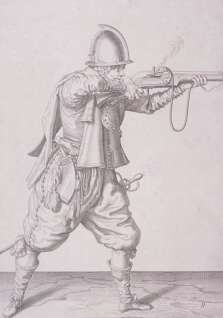Figure in military clothing firing a musket and wearing a sword, 1607. One of four images.