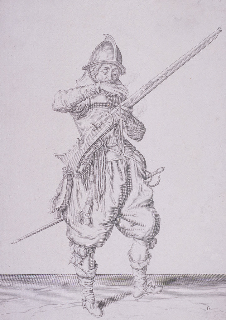 Figure in military clothing holding a musket and wearing a sword, 1607. One of four images.