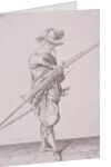 Figure in military clothing holding a musket and wearing a sword, 1607. One of four images.