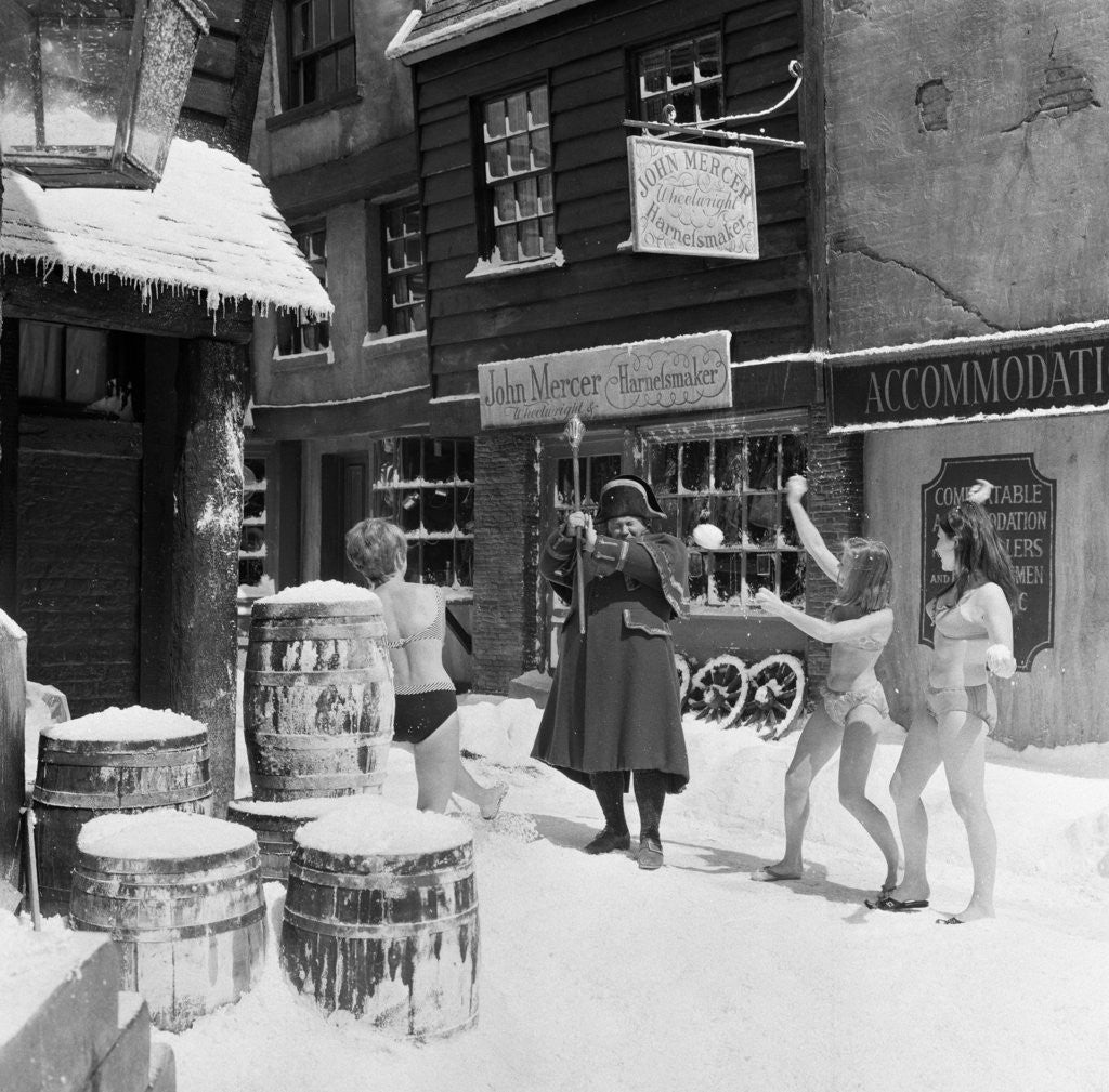 Filming of Oliver! at Shepperton studios. The scene which should have been shot in mid winter was being shot in August with a ton of featherlight polystyrene strewn about to represent the snowfall and artificial icicles hanging from ledges and pipes etc. Three young ladies, Penny Allan, Irene French, and Dinny Jones, all singers who are taking part in the film decided to get into bikini's, snowball Harry Secombe and generally frolic in the 'snow'. 3rd August 1967.