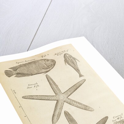 Studies of a 'Square Acarauna' (brought from Surinam, and known by mariners as 'The Old Wife'); a 'Mailed Fish of Brasile' (Brazil) - 'Cataphractus Schonveldii' in Grew's description; upper and lower views of a 'Smooth Star-Fish or Sea-Pad, Stella marina laevior ... sent from the East-Indies'; and a 'Crowned Star-Fish. Stella marina coronalis ... taken in the Danish-Sea'. Table 8 from the book Musaeum Regalis Societatis; or, A catalogue and description of the natural and artificial rarities belonging to the Royal Society, and preserved at Gresham Colledge, by Nehemiah Grew (second printing: London, 1686). The Royal Society's museum collection, or Repository, was established in the 1660s. It was intended to be 'a General Collection of all the Effects of Arts, and the Common, or Monstrous Works of Nature', for use by the Fellows in their attempts to understand and classify the natural world.
