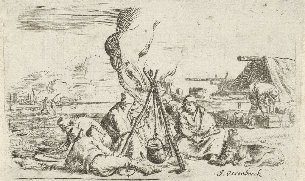Five soldiers around a campfire, Jan van Ossenbeeck, 1647 - 1674