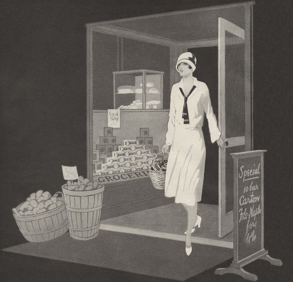 Product details Flapper woman coming out of grocery store