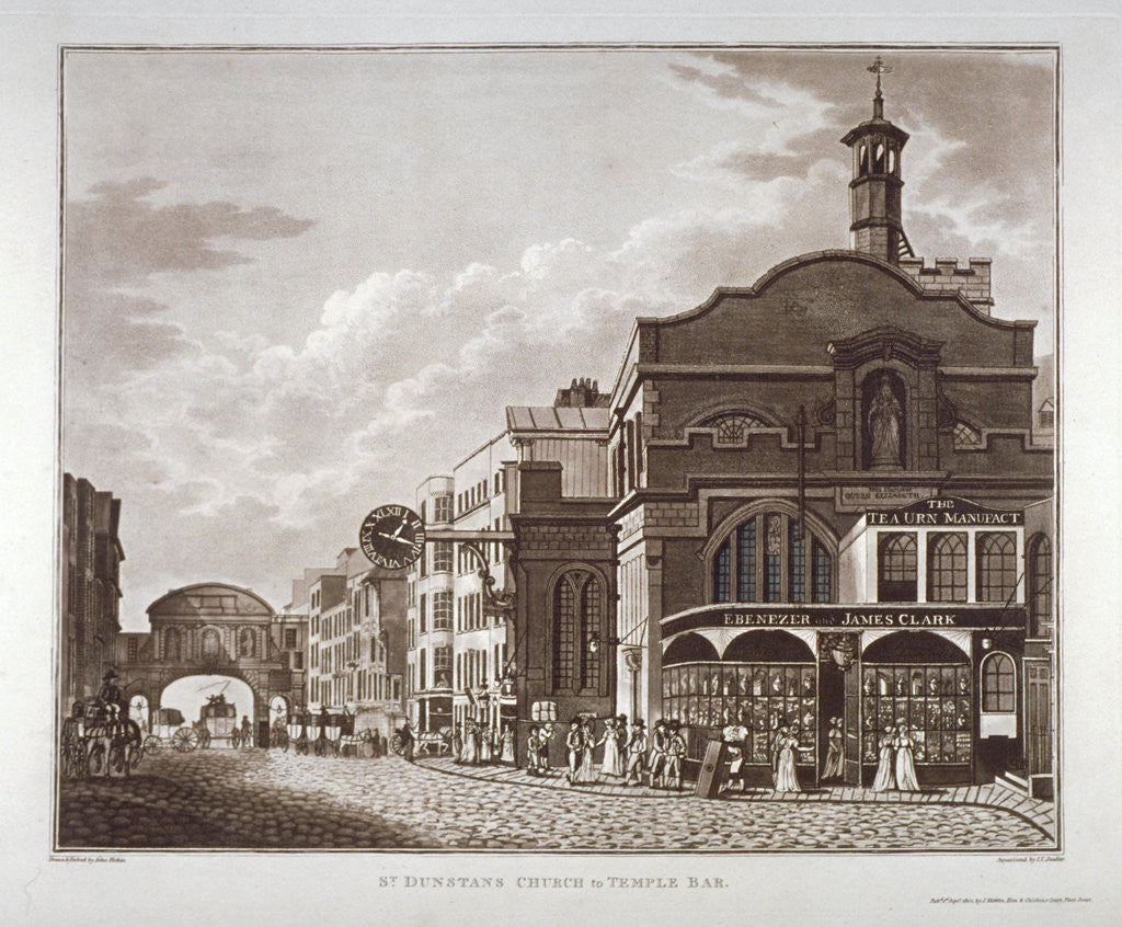 Fleet Street from St Dunstan in the West to Temple Bar, City of London, 1802. View showing figures and horse-drawn traffic in the street, and the shop of Ebenezer and James Clark, Tea Urn Manufacturers.