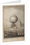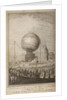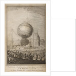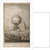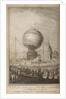View of a Montgolfier balloon being launched on a first flight at Versailles, France carrying a sheep, a rooster, and a duck. The balloon test lasted approximately eight minutes and was conducted before an audience that included Louis XVI, whose support for such experiments was being solicited. Frontispiece plate from the book Description des expÚriences de la machine aÚrostatiques de MM.de Montgolfier, by Faujas de Saint-Fond (Paris, 1783).