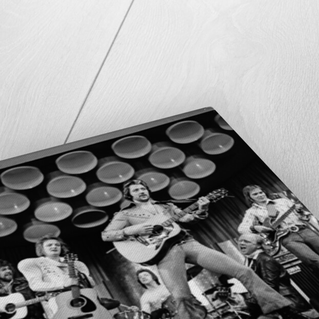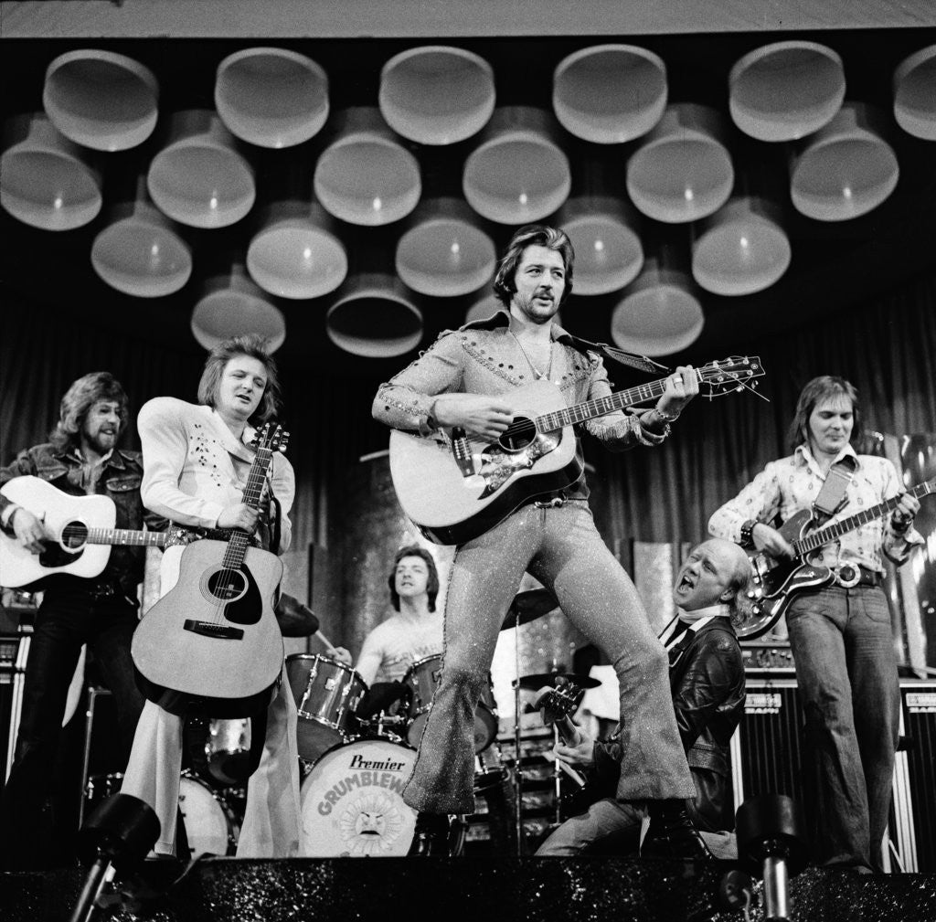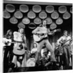 Leicester City footballer Frank Worthington dressed as Elvis Presley supported by the Grumbleweeds Group at the Bailey's Club in Leicester. 28th February 1975.