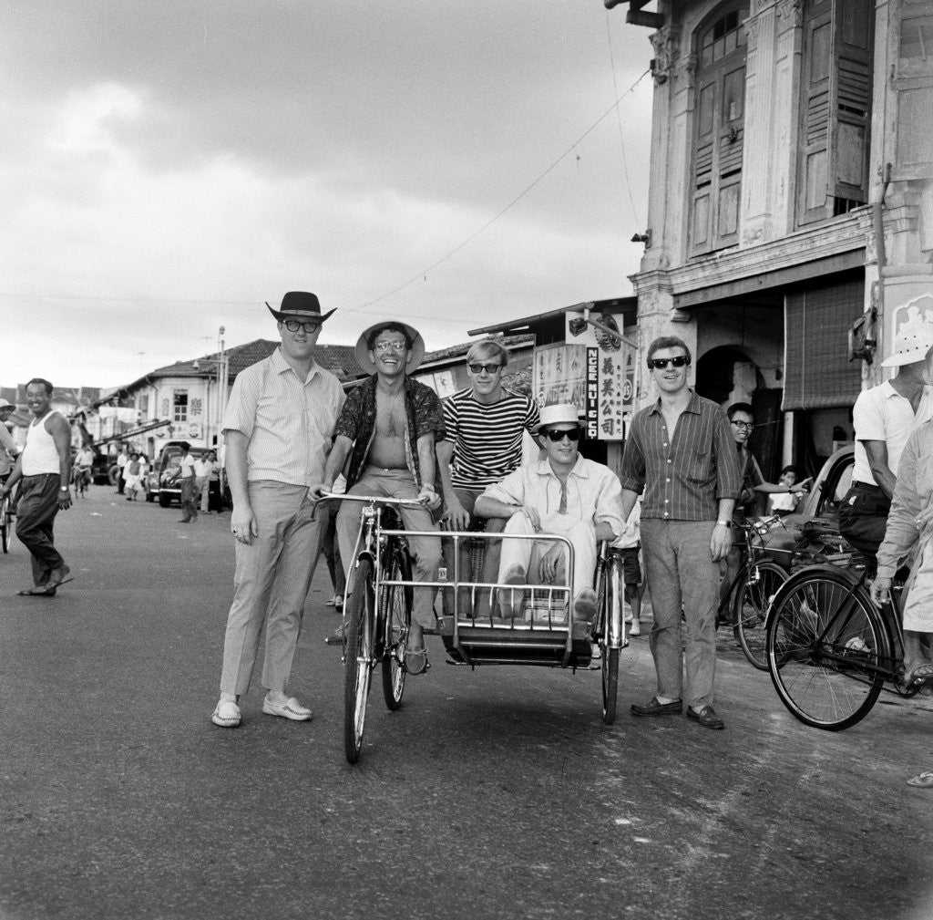 Manchester pop group Freddie and the Dreamers pictured in Singapore during their world tour. Here the band led by singer Freddie Garrity are pictured making their way around the city on bicycle. 30th March 1965.
