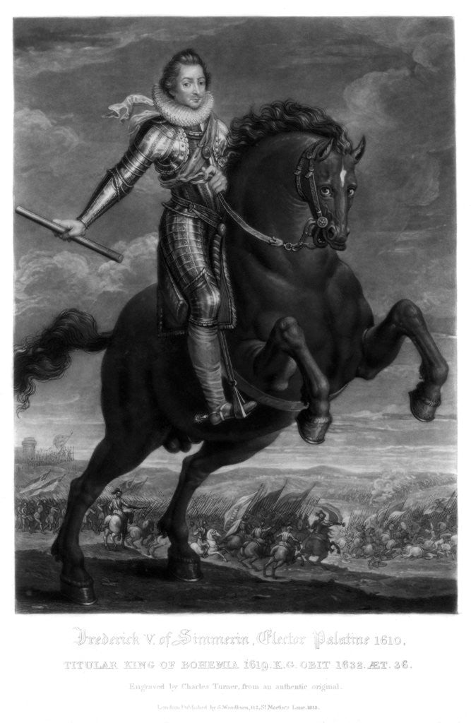 Frederick V, Elector Palantine, (1816). Frederick, Elector Palatine (1610-1623) was offered the crown of Bohemia when the kingdom's Protestant Diet deposed the Catholic King Ferdinand II, the Holy Roman Emperor. Frederick accepted, and was crowned in Prague in November 1619. Unfortunately for Frederick, he did not receive the support he expected from his father-in-law King James I of England and the Protestant League, an alliance of German states, and he was defeated and overthrown at the Battle of White Mountain in 1620. The brevity of his reign earned him the derisive title of the Winter King. A print from Fifteen Splendid Portraits of Royal Personages, engraved in mezzotinto by Richard Earlom, Charles Turner and R Dunkarton, printed by J McCreery, Black Horse Court, Fleet Street, London, 18161