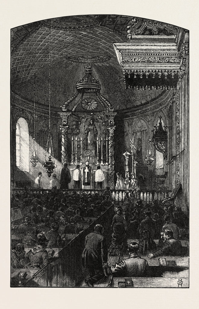 French Canadian Life, Interior of Parish Church, Canada, Nineteenth Century Engraving