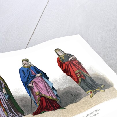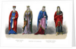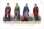 French costume: Capetian, Carlovingian, (1882). The Capetian dynasty was a line of French kings who ruled from the late 10th century to 1328. The Carlovingian or Carolingian dynasty of Frankish kings ruled parts of Western Europe from the 8th to the 10th century. Illustration from The History Of Fashion In France by Augustin Challamel, Frances Cashel Hoey and John Lillie, (1882).