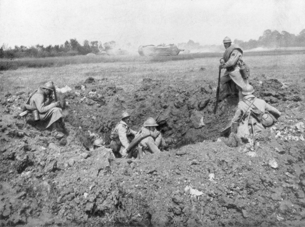 French infantry resting in a shell hole, Chemin des Dames, France, 11 June 1918. A strategically important ridge overlooking the River Aisne, the Chemin des Dames was the site of several major battles between 1916 and 1918.