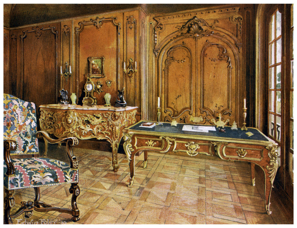 French panelled room, Wallace Collection, London, 1911-1912. Style of the regence. Carved oak chair, Ormolu mounted mahogany writing table and Ormolu mounted bombe commode. A print from The Book of Decorative Furniture its Form, Colour and History, Volume II by Edwin Foley, TC and EC Jack Ltd, London, 1911-1912.