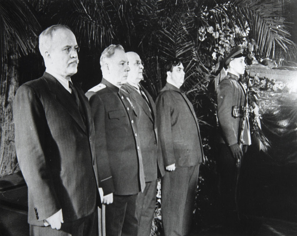 Funeral of Joseph Stalin, Moscow, USSR, March 1953. Present (from left to right) are Soviet Foreign Minister Vyacheslav Molotov (1890-1986), Chairman of the Presidium of the Supreme Soviet Kliment Voroshilov (1881-1969), Minister for Internal Affairs Lavrentiy Beria (1899-1953) and Premier Georgy Malenkov (1902-1988). Found in the collection of the State Central Museum of Contemporary History of Russia, Moscow.