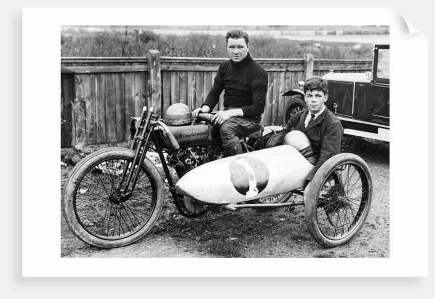 FW Dixon on a Harley-Davidson, with a passenger in the sidecar, 1921.