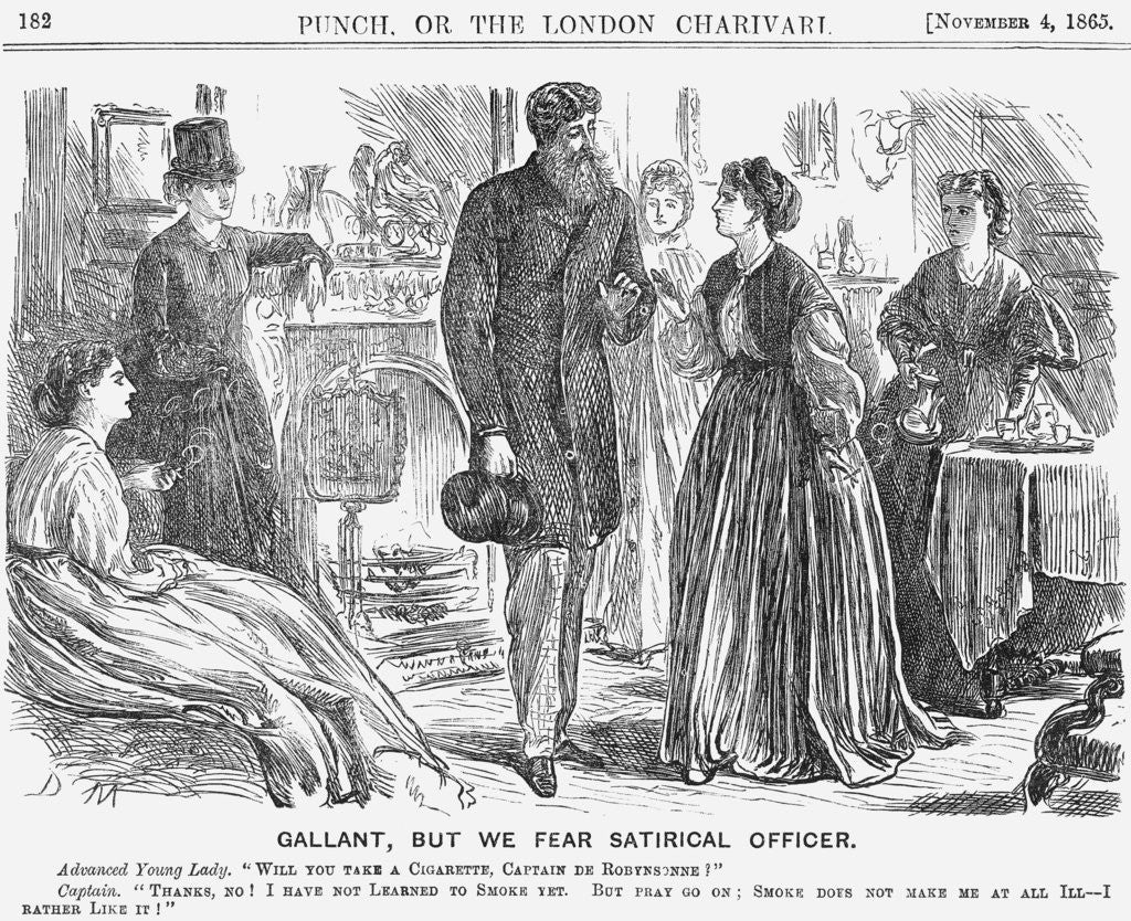 'Gallant, but we fear Satirical Officer', 1865. A group of young women all smoking, and having tea. One of them asks the man if he would like a cigarette, but he declines. Occasionally, young ladies of advanced ideas would take up smoking and, in this cartoon, Mr Punch has a satirical dig at these women by contrasting their emancipated behaviour with the restraint shown by just the sort of person who would normally be seen enjoying the pleasures of tobacco. From Punch, or the London Charivari, November 4, 1865.