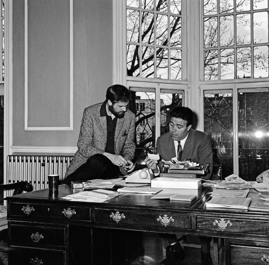 Ray Galton and Alan Simpson on tour for new ideas, and also for possible next Steptoe series. Pictured here at the Palatial Offices in Bayswater. 30th April 1964.
