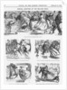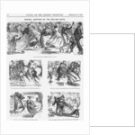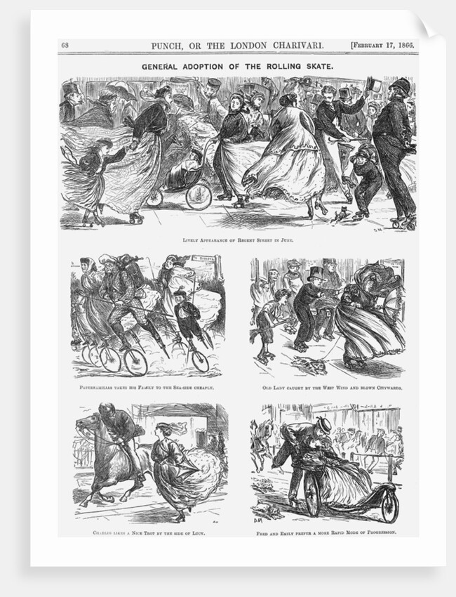 'General Adoption of the Rolling Skate', 1866. Men, women and children are all on roller skates, going about their usual business. In the top picture even the policeman is on skates. In the middle on the right, an old woman is being swept alongn by the wind on skates. To the left of her is a chimneysweep on skates. On the bottom left a man rides a horse while keeping up with a young woman who is skating down the road. Roller skating was all the fashion and, in this cartoon, Mr Punch shows the various ways in which the new craze could be used to keep the country moving. From Punch, or the London Charivari, February 17, 1866.