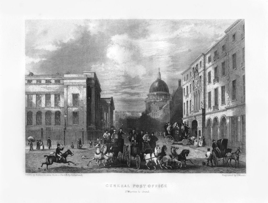 General Post Office, London, 19th century. View down Saint Martin's-le-Grand, with St Paul's Cathedral in the distance.