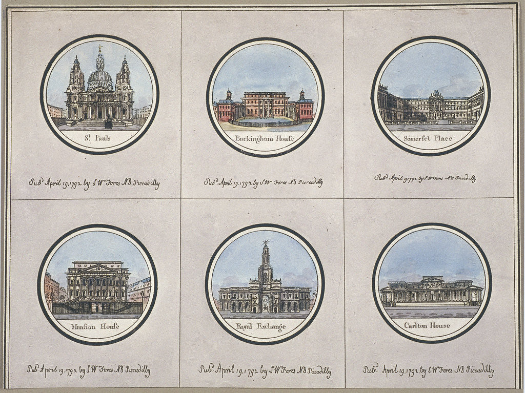 General views of London, 1792. Upper section shows three views of St Paul's Cathedral, Buckingham House and Somerset House. Lower section shows three views of Mansion House, Royal Exchange and Carlton House.