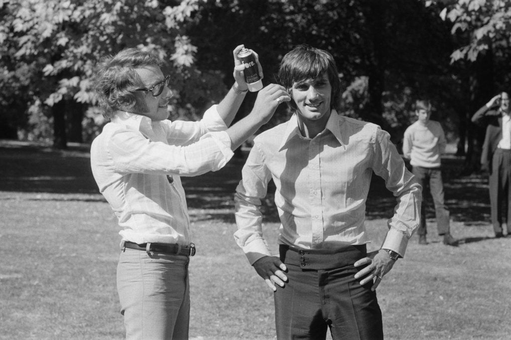 Manchester United footballer George Best has hair spray applied by his personal hairdresser Malcolm Wagner in Hyde Park before acting in a television commercial for mens cosmetics. 27th July 1969.