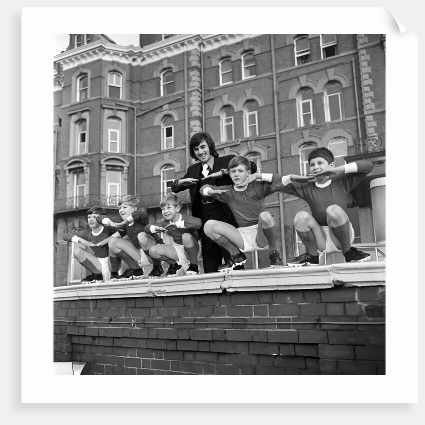 George Best with kids from a Children's Home pictured outside the Imperial Hotel, Blackpool. He is launching a new soccer shoe which carries his signature on the side. The children are modelling the shoes and were given a complete United strip and a pair of the shoes. January 1970.