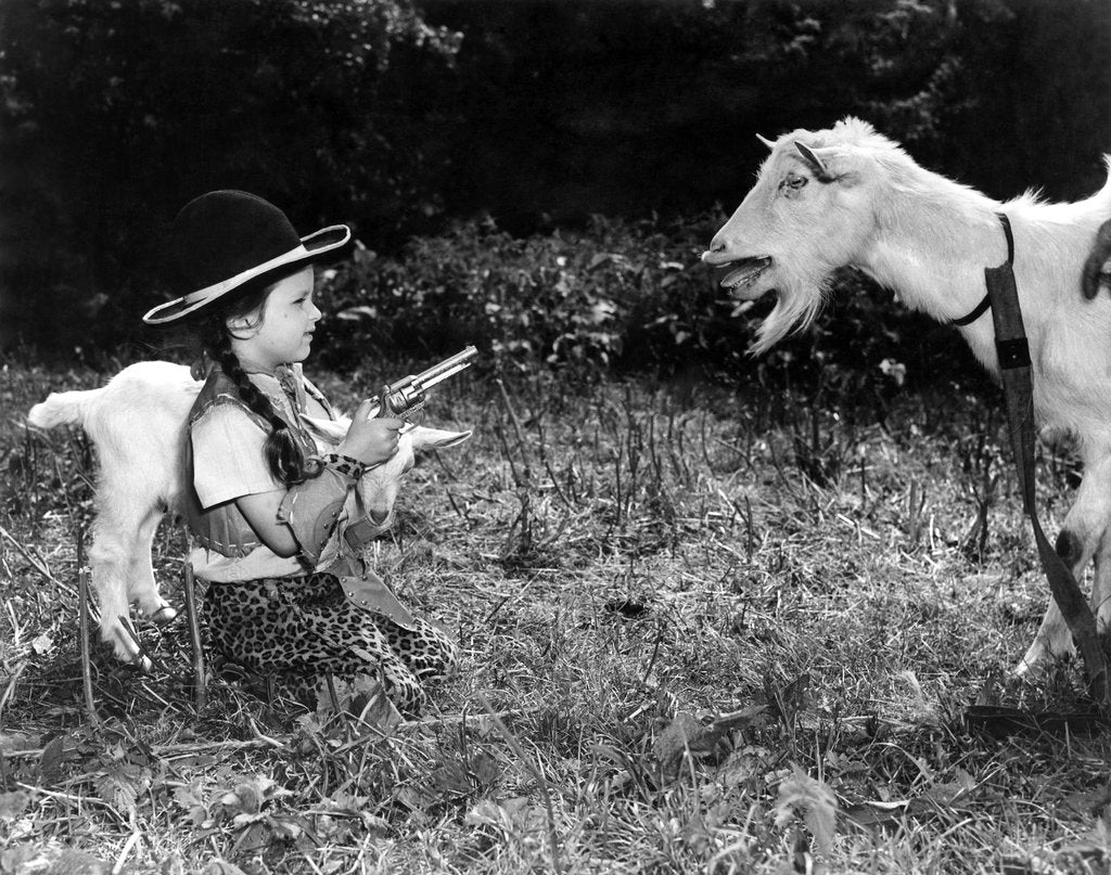 Gerald Portlock's grand daughter, 4 year old Carmen 'holds up' the Nanny goat - 'your money or your kids'. May 1952