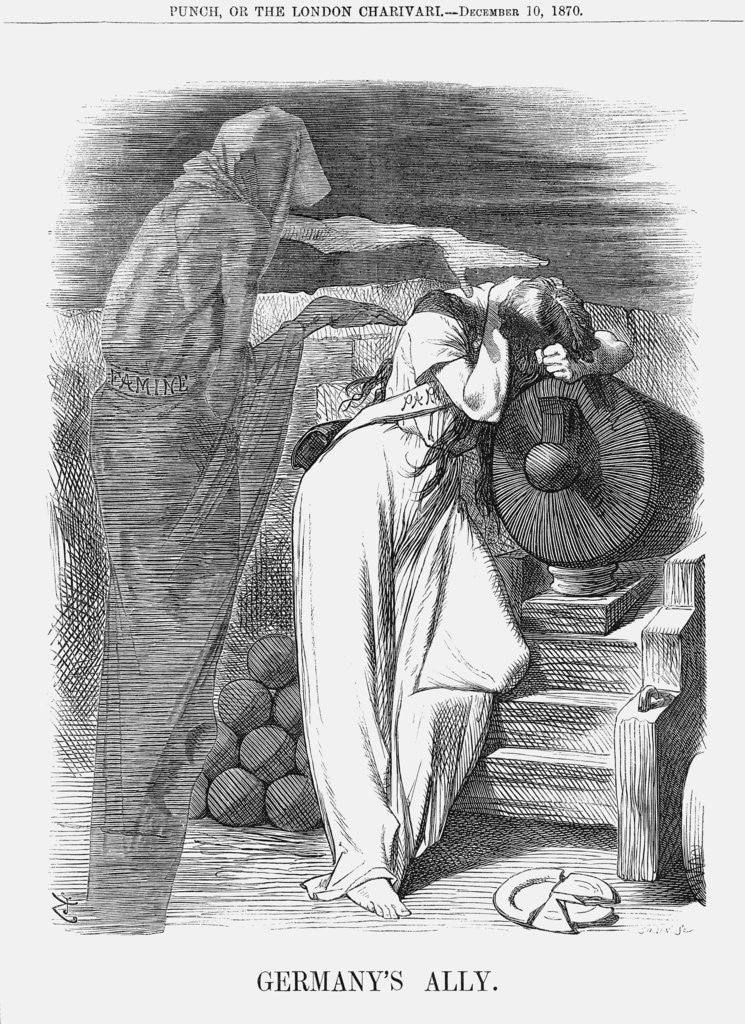 'Germany's Ally', 1870. Famine is shown spreading its hands over Paris as she weeps by the city's defences. France had declared war on Prussia, but had been defeated on almost every front. The Emperor Napoleon was in Prussian custody, and Prussia now had Paris virtually under siege. The people were beginning to starve. This was a particularly important war as it enabled the final unification of Germany. The famine in Paris was the newly formed Germany's ally. From Punch, or the London Charivari, December 10, 1870.