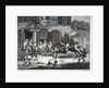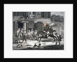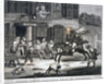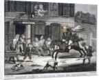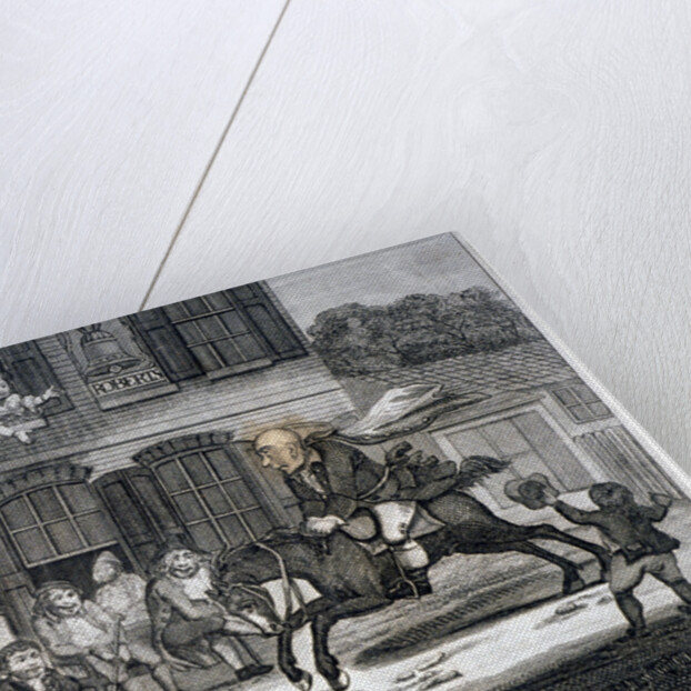 'Gilpin going farther than he intended', 1784. Gilpin galloping from right to left past the Bell inn, Edmonton. Mrs Gilpin and two others are looking from an upper window. Various figures in and outside the inn are showing amusement. A pig and a dog are in the foreground.
