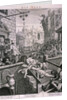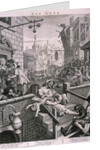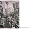 'Gin Lane', 1751.The scene is the St Giles slums. A child falls to its death from the arms of its drunk mother who sits with ulcerated legs. A skeletal figure holds an empty glass. Goods are being pawned in order to buy gin, a baby is being fed with gin, a corpse is put into a coffin in the background.The pawnbroker, distiller and undertaker are the only well-off and successful people in the neighbourhood. Third of four states of plate. This print was published in support of a campaign directed against gin drinking among London's poor. Consumption of cheap spirits by the poor had soared in the early eighteenth century, with dire social consequences. Gin inspires violence and careless inebriation. Addiction to spirits leads to negligence, poverty and death.