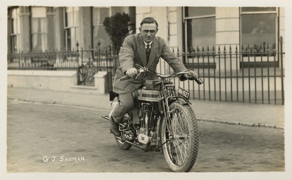 G.J. Sheman poses aboard Triumph registration MN1527, 1921 TT (Tourist Trophy)